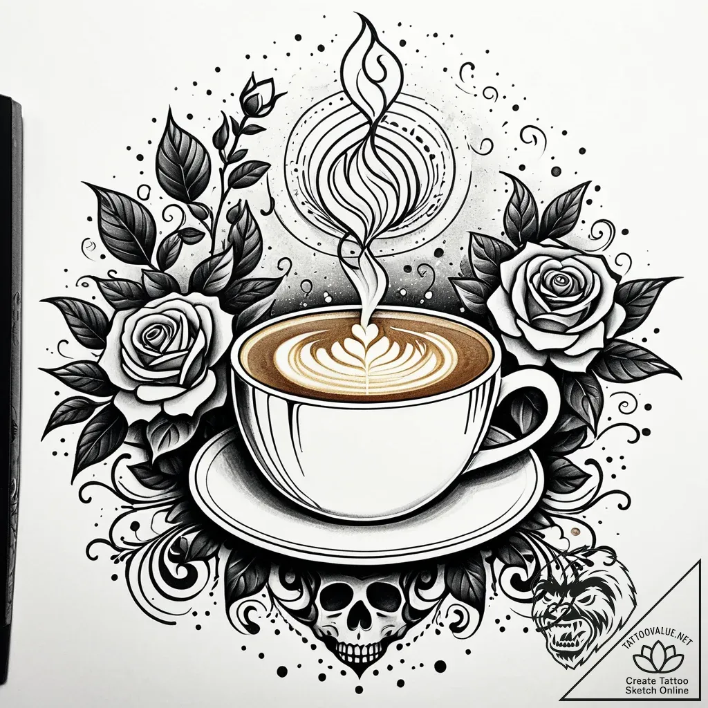 This tattoo sketch is a delicate symphony of coffee culture and chicano aesthetics, where swirling steam from a latte art-adorned cup blossoms into floral patterns, framed by classic roses and a subtly placed skull. The dotwork shading and fine line black and grey create a vintage feel, like a cherished memory etched in time. The composition is balanced and evocative, hinting at the complex beauty found in everyday rituals and life's ephemeral nature.