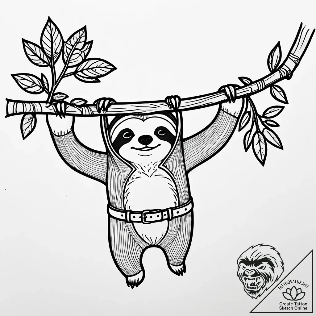 This charming sketch captures a whimsical sloth suspended from a branch, rendered in bold, clean linework. The graphic style, reminiscent of classic tattoo flash, uses thick black outlines and simple, stylized leaves to create a minimalist yet impactful design. The composition evokes a sense of relaxed contentment, a perfect visual metaphor for embracing a slower pace of life.