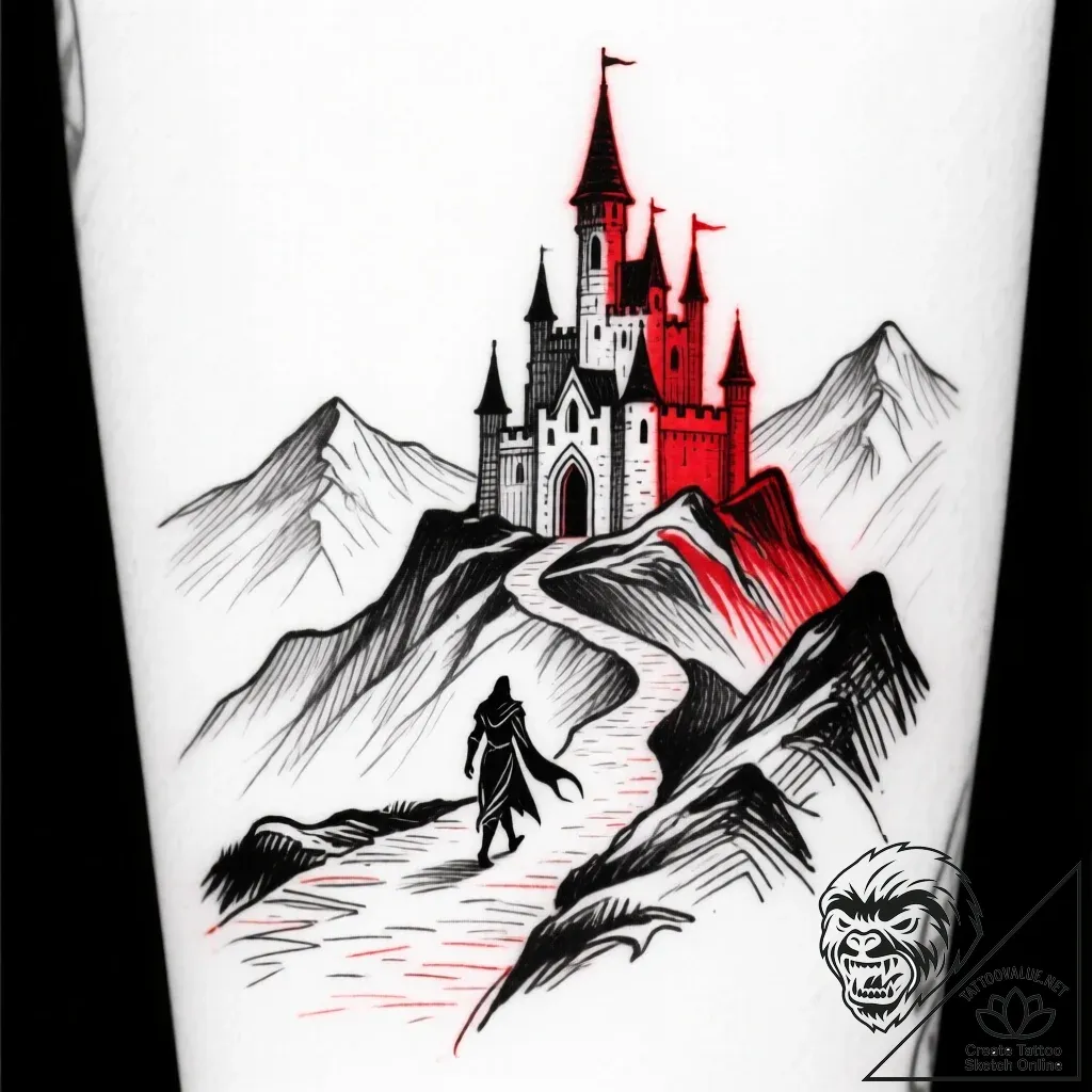 This tattoo embodies the spirit of a quest, representing a personal journey towards a significant goal or ambition. The castle symbolizes aspiration, power, and achievement, while the solitary figure on the winding path signifies determination, resilience, and the courage to face challenges. It can reflect a desire for self-discovery, the pursuit of dreams, or a bold statement of personal strength.