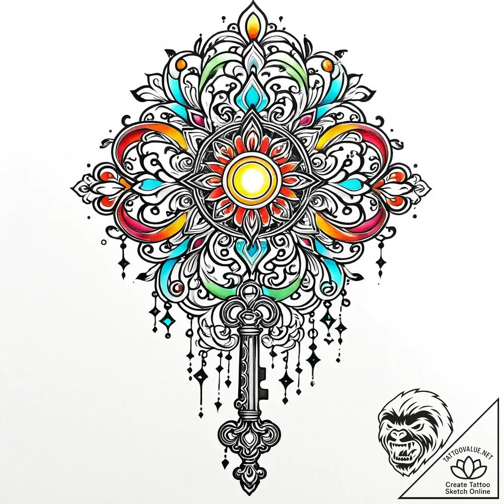 This vibrant tattoo sketch explodes with intricate, ornamental beauty, a sun-kissed key suspended from a mandala-like cascade of flowing patterns and filigree. The bold, heavy linework creates a strik