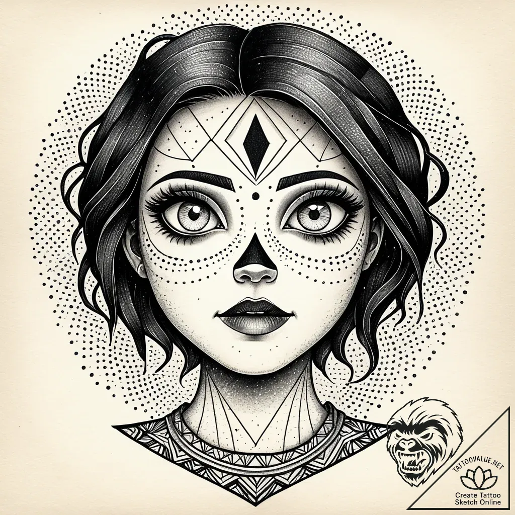 This striking dotwork design captures a serene yet determined gaze, reminiscent of a guardian spirit or a muse of inner strength. The interplay of bold outlines and delicate stippling crafts a face th