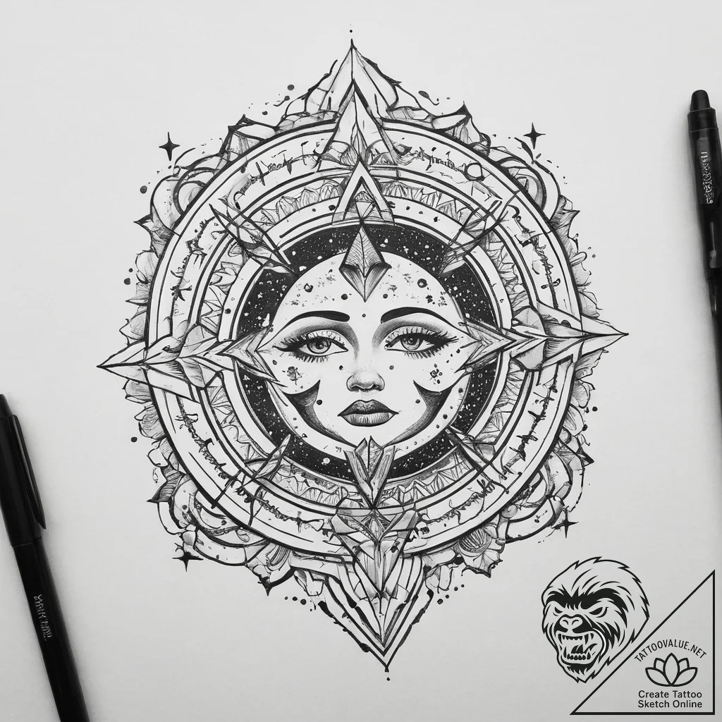 Presenting a one-of-a-kind tattoo sketch, prepared based on your request “tattoo sketch cosmic scene, tattoo flash sheet design, blackwork tattoo style, dark art, bold black areas, heavy black ink, bold outlines, thick lines, heavy linework, on a clean white paper, isolated, muted color palette, desaturated colors, vintage tattoo feel” at tattoovalue.net.