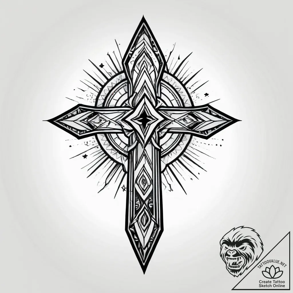 This tattoo sketch is a stark, graphic masterpiece, resembling a crystalline prism forged from pure light and sharp, geometric forms. The black linework, reminiscent of pen and ink hatching, creates a sense of depth and complexity within the abstract realism, evoking a powerful, almost celestial energy.