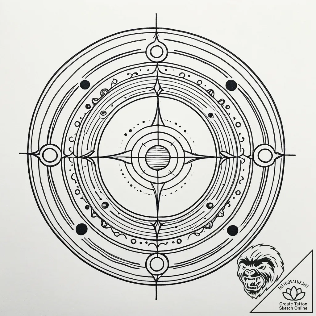 This sketch is a celestial mandala, a cosmic blueprint etched with delicate linework and a raw, hand-drawn charm. Concentric circles and radiating lines create a universe of subtle movement, punctuate