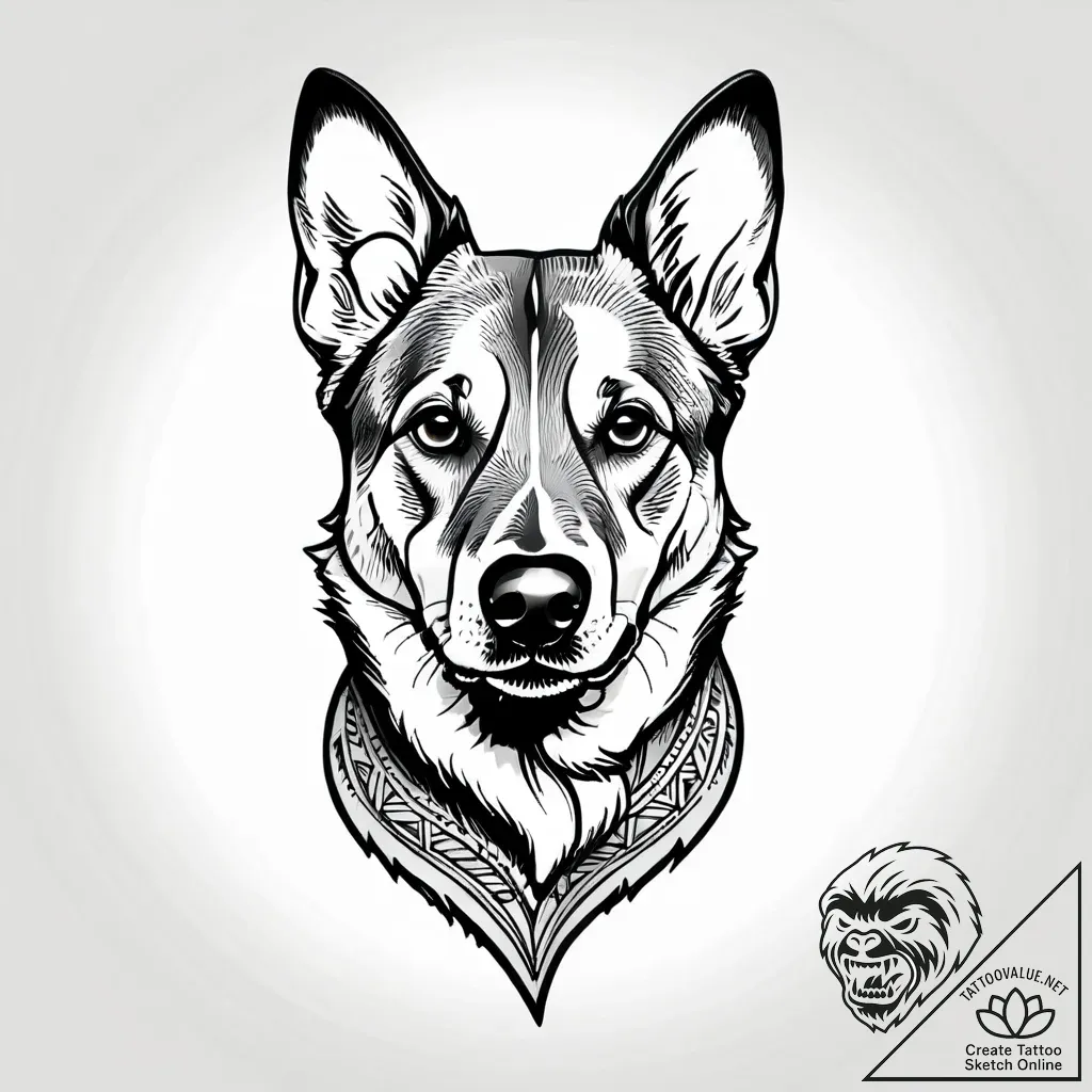 This sketch captures the soulful gaze of a loyal canine, rendered with rough, expressive pencil lines that hint at an ancestral spirit. Tribal markings gracefully meld into the fur, creating an orname