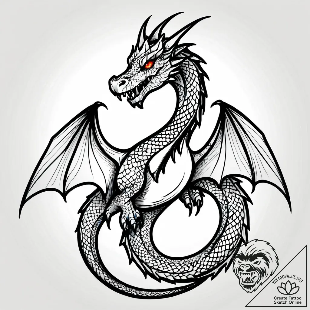 - Original User Request (RU): tattoo sketch, dragon entwined with glowing crystals and moonlight, fantasy mystic tattoo, tattoo line art, sketch tattoo style, hand-drawn effect, rough lines, unfinished artistic look, cross-hatching, dotwork shading, stippling texture, pointillism effect for tattoo, on a clean white paper, isolated, black and red ink, red accent, dramatic two-tone