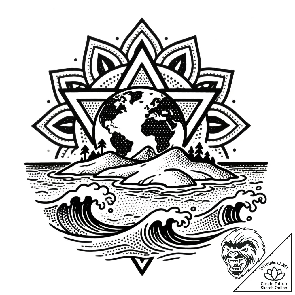 This striking graphic tattoo sketch unveils a miniature world, an Earthsea island cradled within the embrace of a sacred geometry mandala. Crashing waves, rendered with stippling and pointillism, surge with raw, untamed energy, a stark contrast to the serene, symmetrical patterns that frame the scene. The pure linework and black outline create a bold, timeless aesthetic, evoking a sense of ancient wisdom and interconnectedness.