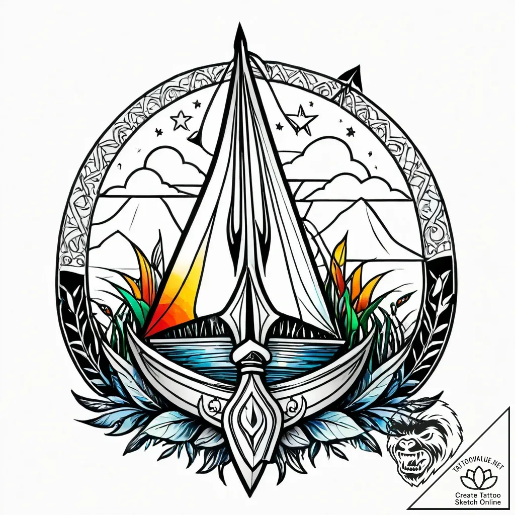 This striking design encapsulates a dynamic scene, a spear piercing through a vibrant jungle under a sky dotted with stars and clouds. The bold, classic lines evoke the spirit of old-school traditional tattoos, with a rough, hand-drawn pencil sketch effect that imbues it with raw energy and artistic imperfection. The composition, framed by an intricate circular motif reminiscent of a compass rose, suggests a journey or a quest, enhanced by the splash of vibrant, full-spectrum colors that bring the tropical flora to life.