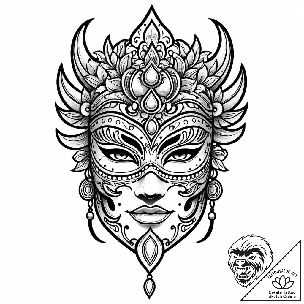 - Original User Request (RU): tattoo sketch, el dorado golden mask close-up, ornate tattoo design, tattoo line art, on a clean white paper, isolated, muted color palette, desaturated colors, vintage tattoo feel, blackwork tattoo style, dark art, bold black areas, heavy black ink, soft whip shading, pepper shading, smooth dot shading