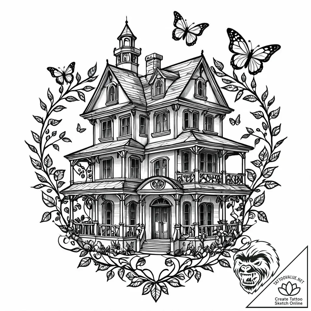 - Original User Request (RU): tattoo sketch, encanto house intertwined with magical vines and butterflies, lively architectural tattoo, artistic tattoo sketch, bold outlines, thick lines, heavy linework, on a clean white paper, isolated, old school traditional tattoo, american traditional, bold lines, classic sailor tattoo motifs, black and grey tattoo shading, smooth gradients