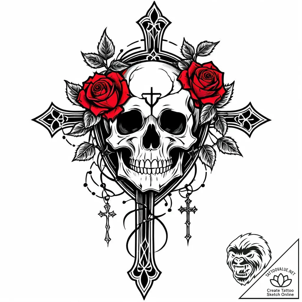 This striking sketch is a dark romantic ballet of life and death, rendered in a fine-line, single-needle style that whispers rather than shouts. A gothic skull, its empty sockets holding secrets, is framed by the stark geometry of a cross, softened by the passionate bloom of thorned roses, their crimson accents a poignant echo of life against the monochrome. The composition is a delicate dance of sharp edges and organic curves, creating a dramatic, two-tone narrative.