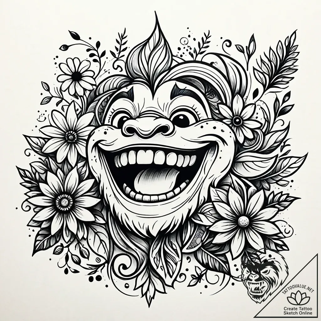 • Original User Request (RU): tattoo sketch, gran crood laughing with wildflowers, joyful feminine tattoo, tattoo flash sheet design, on a clean white paper, isolated, vibrant colors, full color spectrum, bold bright tattoo inks, ornamental tattoo, decorative patterns, filigree, intricate details, flowing patterns, rough sketchy lines, hand-drawn pencil sketch effect, artistic unfinished look