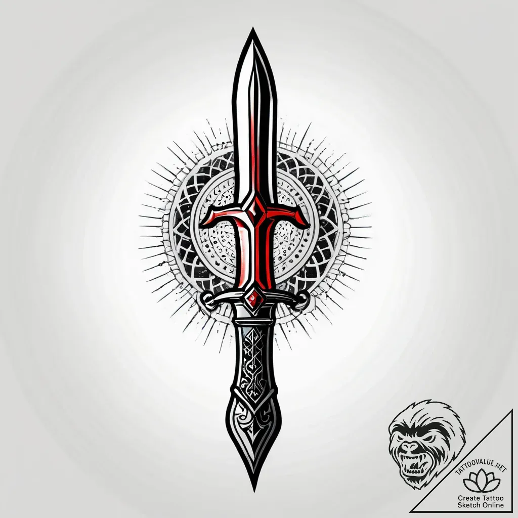 This striking tattoo sketch features a mystical sword, rendered in a dramatic two-tone black and red ink, radiating with an ethereal glow. Its sharp, geometric form is emphasized by intricate dotwork,
