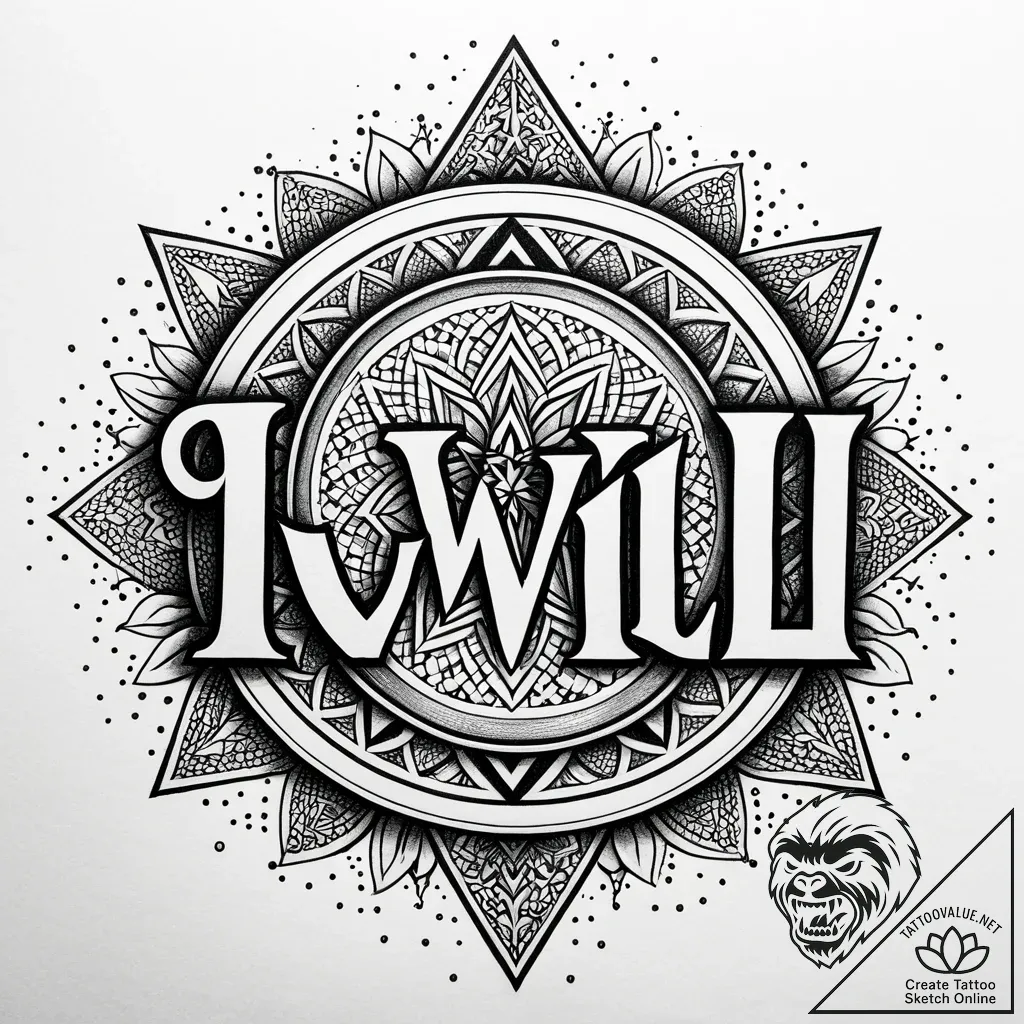 This striking black and grey tattoo sketch features the bold declaration "I Will" rendered in a regal, serif font, encircled by an intricate, geometric mandala. The stippling and pointillism technique