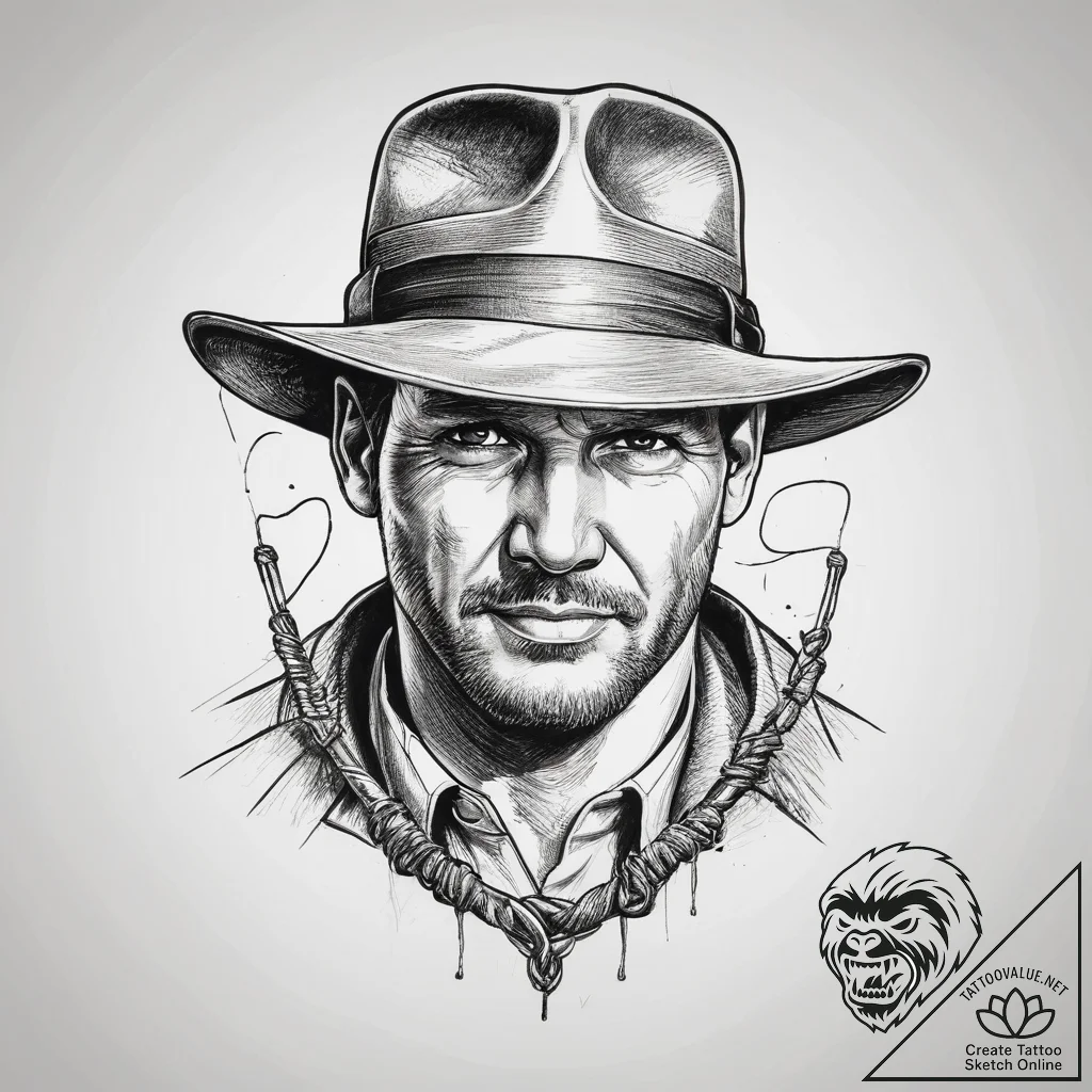 This stylish design inspired by “tattoo sketch indiana jones hat and whip, tattoo flash sheet design, sketch tattoo style, hand-drawn effect, rough lines, unfinished artistic look, cross-hatching, on a clean white paper, isolated, sepia tone sketch, vintage paper look, bold outlines, thick lines, heavy linework” was prepared especially for you at tattoovalue.net.