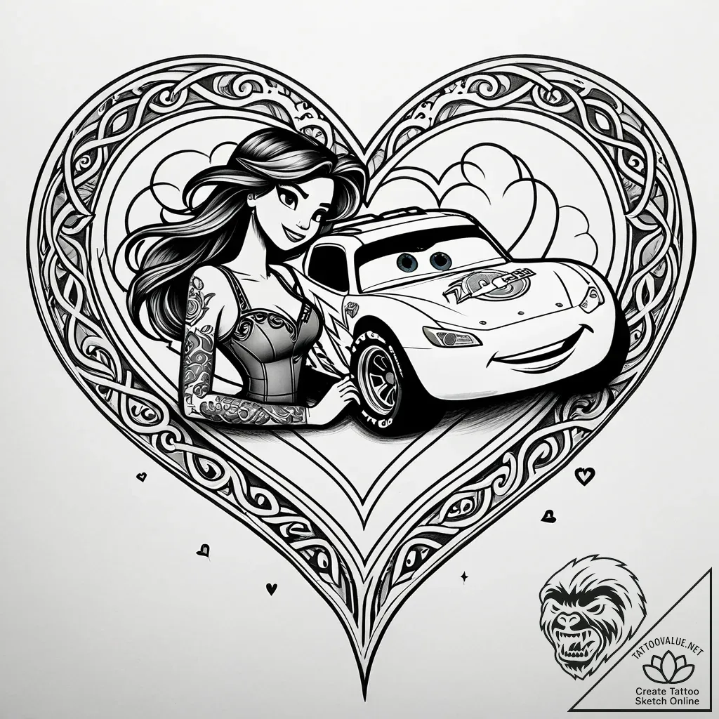 This sketch is ideal for individuals who cherish unique storytelling and bold declarations of affection, appealing to fans of "Cars" with a sophisticated aesthetic. It would look striking on the forearm, allowing the intricate details to be admired, or as a prominent piece on the back between the shoulder blades, creating a statement of enduring love and personal style.