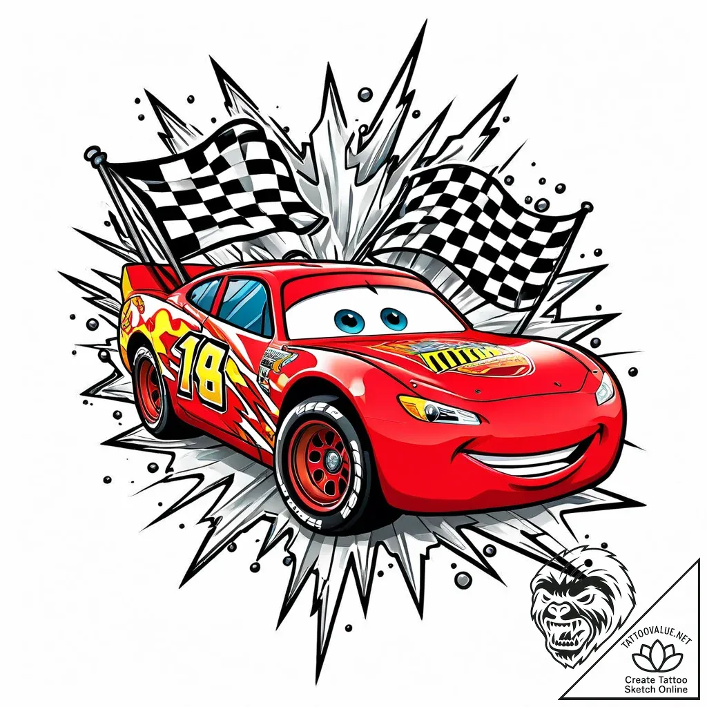 - Original User Request (RU): tattoo sketch, lightning mcqueen winning checkered flag, victorious tattoo, concept art for tattoo, new school tattoo style, vibrant colors, cartoonish, graffiti art inspired, exaggerated forms, vibrant colors, full color spectrum, bold bright tattoo inks, bold outlines, thick lines, heavy linework, on a clean white paper, isolated