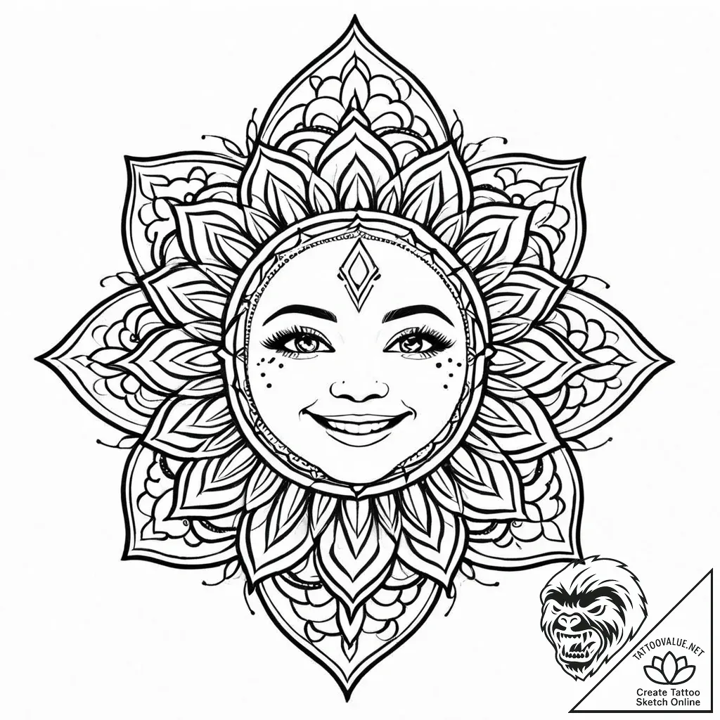 The design embodies the spirit of radiant positivity and inner harmony. The mandala symbolizes the universe and the interconnectedness of all things, while the smiling face represents joy, light, and a vibrant life force. This tattoo can signify optimism, self-love, and a connection to spiritual or cosmic energies.