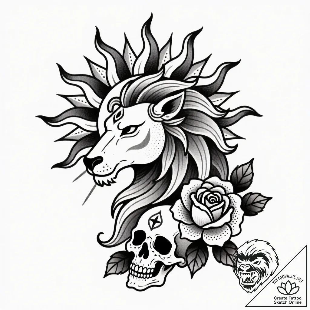 The lion, a universal symbol of strength, courage, and leadership, is amplified by the sun mandala, representing divine power, enlightenment, and life's cycle. The juxtaposition with roses and skulls speaks to the transient nature of beauty and life, embracing both its vibrant moments and its inevitable end, embodying a profound acceptance of existence.