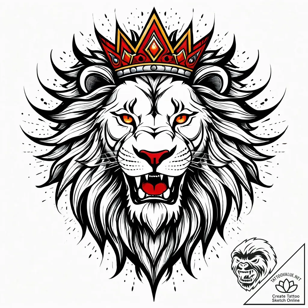 • Final Prompt for AI (EN): tattoo sketch, tattoo design, isolated tattoo sketch on pure white background, tattoo sketch, majestic lion, crowned with tribal sun rays, roaring, fiery mane, regal power, tattoo drawing outline, black and red ink, red accent, dramatic two-tone, new school tattoo style, vibrant colors, cartoonish, graffiti art inspired, exaggerated forms, detailed cross-hatching shading, pen and ink hatching, on clean white paper, isolated