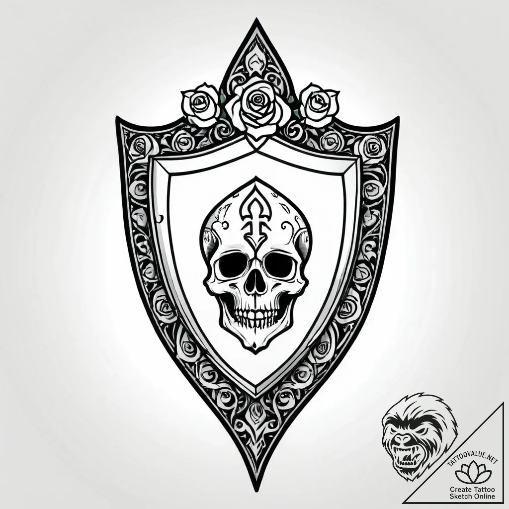 This design powerfully symbolizes the duality of life and death, protection and vulnerability, and the enduring nature of memory. The skull, a classic memento mori, is softened by the romanticism of the roses and the protective strength of the heraldic shield, suggesting a deep respect for mortality and the beauty found even in darkness. It can represent resilience, defiance, and the acceptance of life's inevitable cycle.