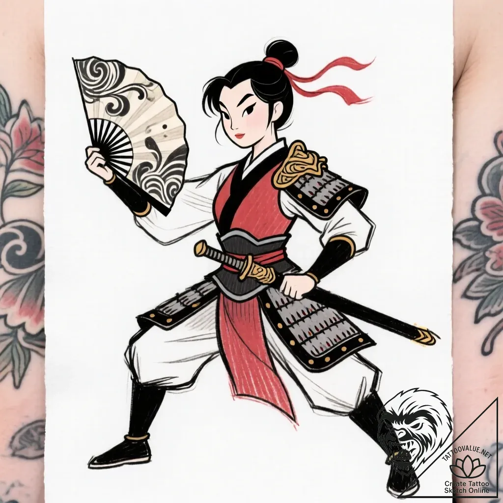 Tattoo sketch, mulan holding fan with warrior... - style Flux Inscriptions - tattoo sketch (26.12.2025 22:57)