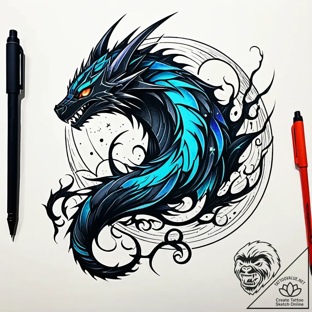 This linework tattoo sketch is a mesmerizing dance of obsidian scales and electric blue energy, evoking the spirit of a nocturnal beast poised in moonlit mystery. The intricate cross-hatching creates