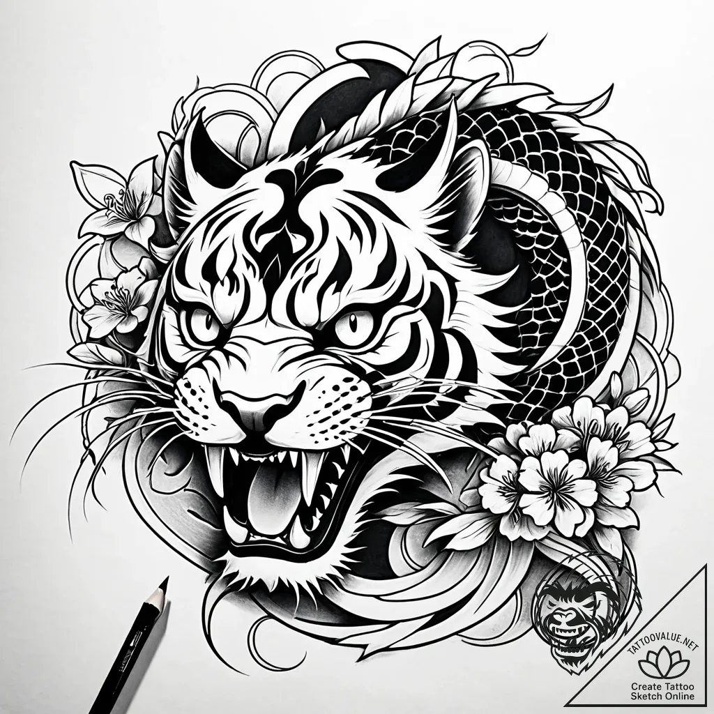 This striking sketch captures the raw power of a tiger's face, rendered in a bold, graphic Irezumi style with rough, sketchy lines that give it an artistic, unfinished allure. The feline's fierce gaze is amplified by sharp, monochrome tones and traditional Japanese motifs like swirling waves and blooming sakura, creating a dynamic composition that feels both ancient and intensely present.