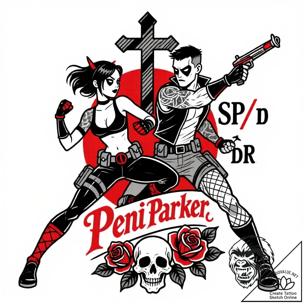 - Original User Request (RU): tattoo sketch, peni parker and sp//dr in action pose, dynamic duo tattoo, tattoo drawing outline, on a clean white paper, isolated, detailed cross-hatching shading, pen and ink hatching, chicano tattoo style, fine line black and grey, religious iconography, lettering, roses, skulls, black and red ink, red accent, dramatic two-tone