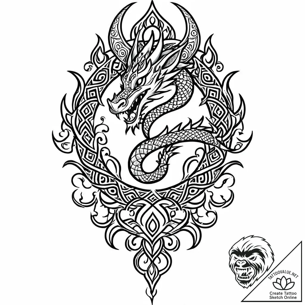 This tattoo sketch is a captivating dance between power and elegance, depicting a dragon emerging from a swirling vortex of tribal and ornamental patterns. The linework is crisp and decisive, creating