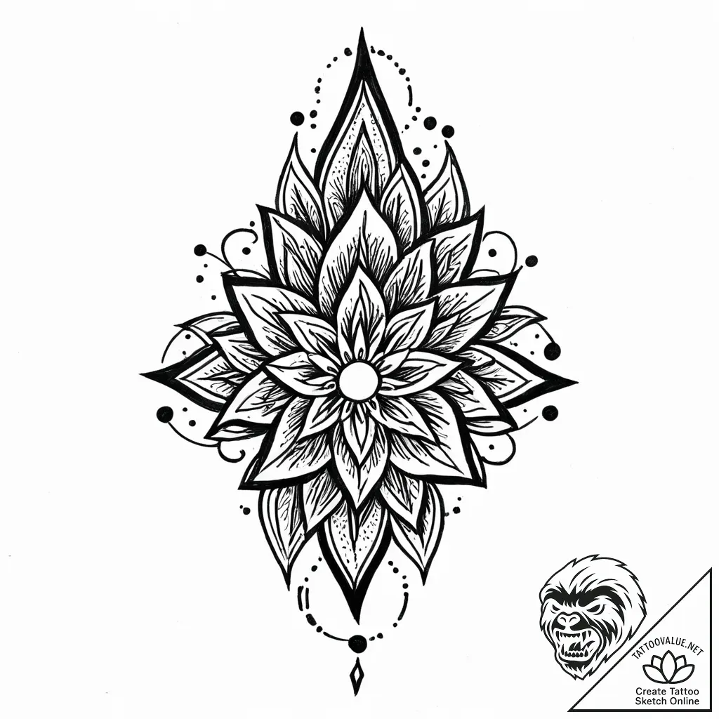 This sketch unfolds like a blooming lotus, a celestial bloom etched in bold blackwork. The linework, imbued with a vintage sepia tone, whispers tales of ancient artistry, while the rough, sketchy lines lend an organic, hand-drawn soul to its dark, graphic form.