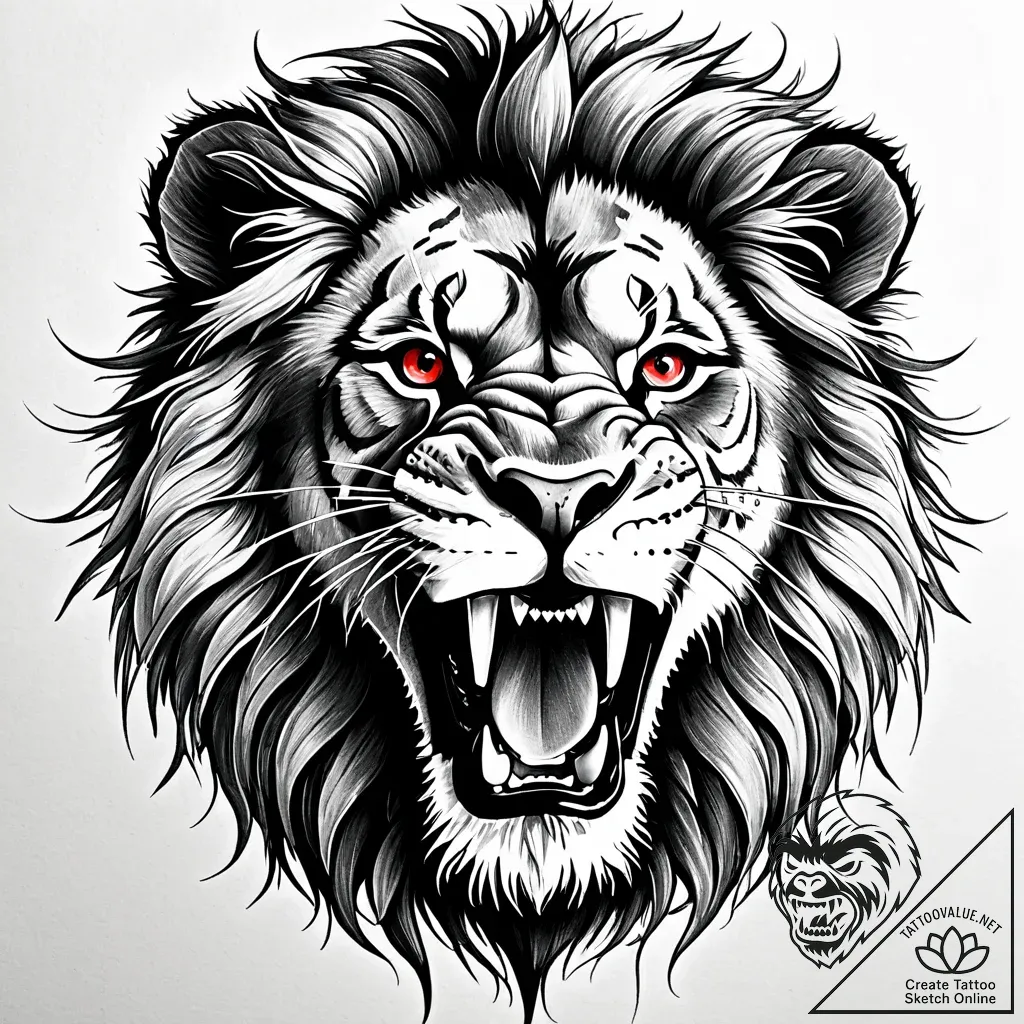 - Original User Request (RU): tattoo sketch, realistic lion roaring with detailed mane and expressive eyes, fierce wildlife tattoo, tattoo sketch design, trash polka tattoo style, black and red ink, collage-like, abstract realism, graphic elements, dotwork shading, stippling texture, pointillism effect for tattoo, on a clean white paper, isolated, black and grey tattoo shading, smooth gradients