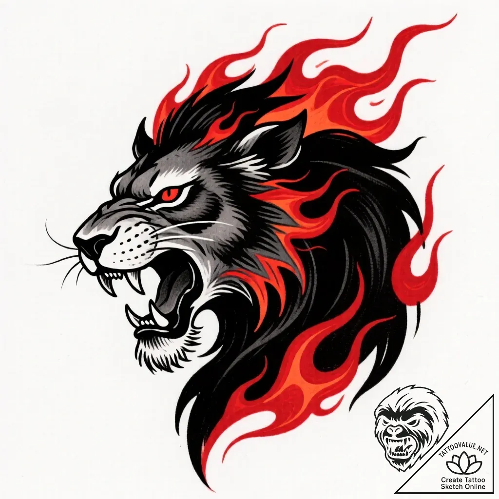 Tattoo sketch, roaring lion with mane ablaze… – style Flux Inscriptions – tattoo sketch (18.12.2025 08:17)