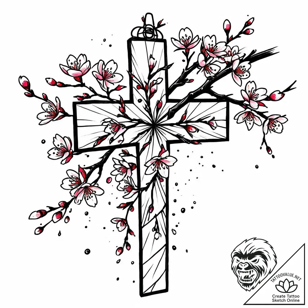 This striking sketch masterfully blends a traditional cross with the ephemeral beauty of cherry blossoms, creating a visual poem of life and renewal. The bold black outline, reminiscent of Japanese wa