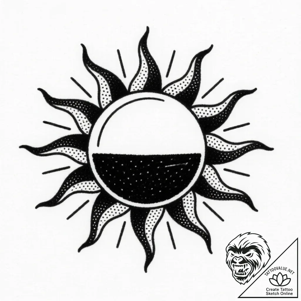 - Original User Request (RU): tattoo sketch, simple thin line sun with rays forming open circle, warm minimalistic tattoo, tattoo drawing outline, on a clean white paper, isolated, vibrant colors, full color spectrum, bold bright tattoo inks, blackwork tattoo style, dark art, bold black areas, heavy black ink, dotwork shading, stippling texture, pointillism effect for tattoo