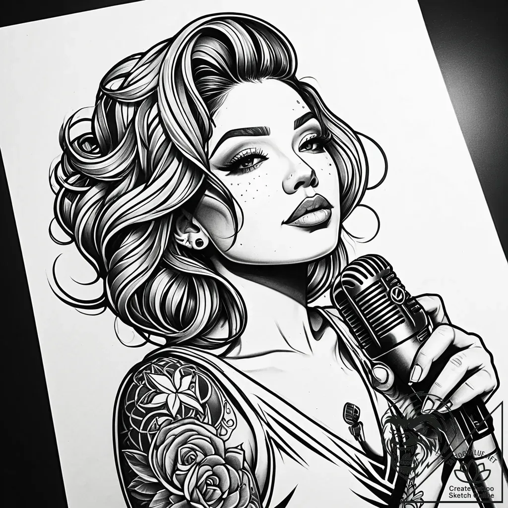 - Original User Request (RU): tattoo sketch, singer portrait with microphone and spotlight, realistic shading capturing passion and soul, tattoo line art, bold outlines, thick lines, heavy linework, on a clean white paper, isolated, black and grey tattoo shading, smooth gradients, sketch tattoo style, hand-drawn effect, rough lines, unfinished artistic look, cross-hatching