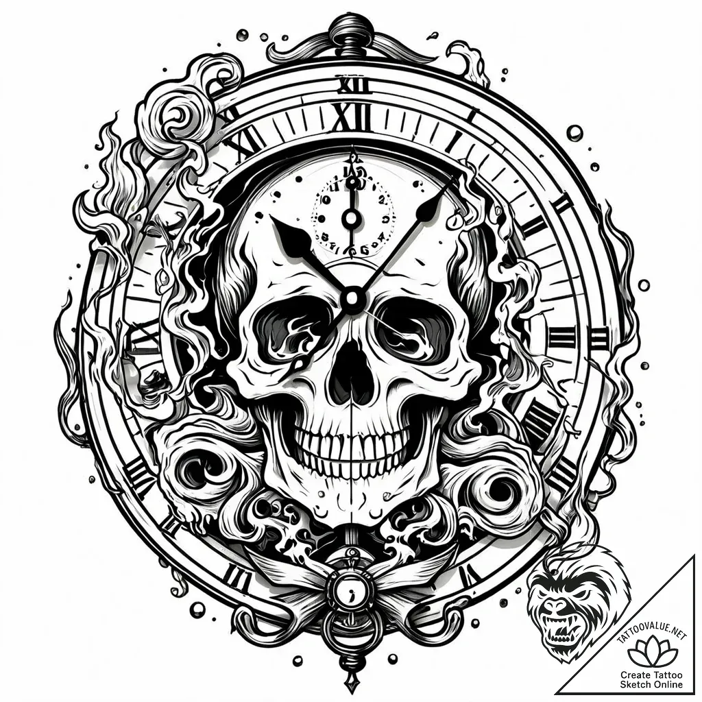 This striking sketch is a powerful fusion of classic American Traditional boldness and surreal, evocative imagery. The skull, rendered with thick, confident lines, emerges from a melting clock face, its Roman numerals distorted like ripples in a temporal stream. Swirling smoke and classic sailor motifs encircle the timepiece, creating a sense of dynamic movement and an almost sepia-toned, vintage paper aesthetic.