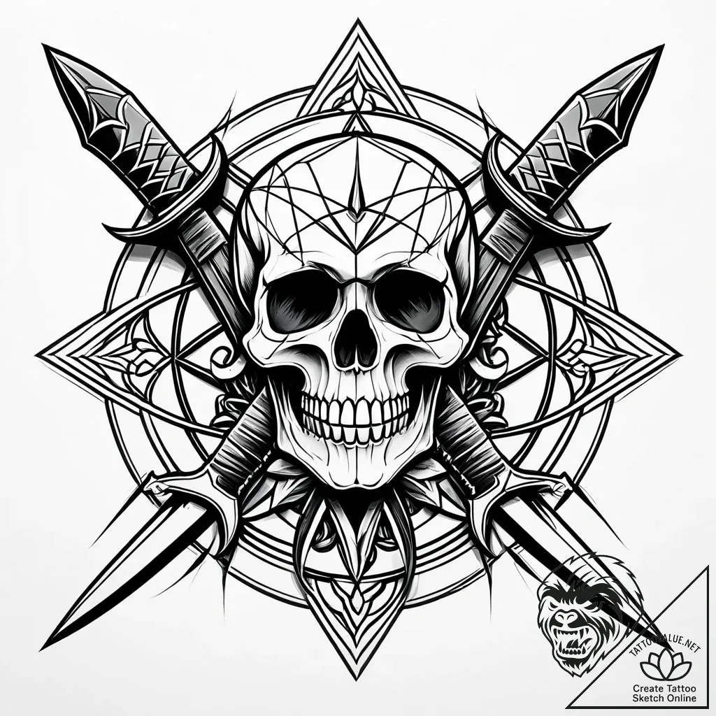 • Original User Request (RU): tattoo sketch, skull intertwined with crossed bones and sharp daggers, dark pirate-inspired ink, tattoo drawing outline, rough sketchy lines, hand-drawn pencil sketch effect, artistic unfinished look, on a clean white paper, isolated, geometric tattoo style, sacred geometry patterns, mandalas, abstract shapes, symmetrical, black and white sketch, monochrome, greyscale tones