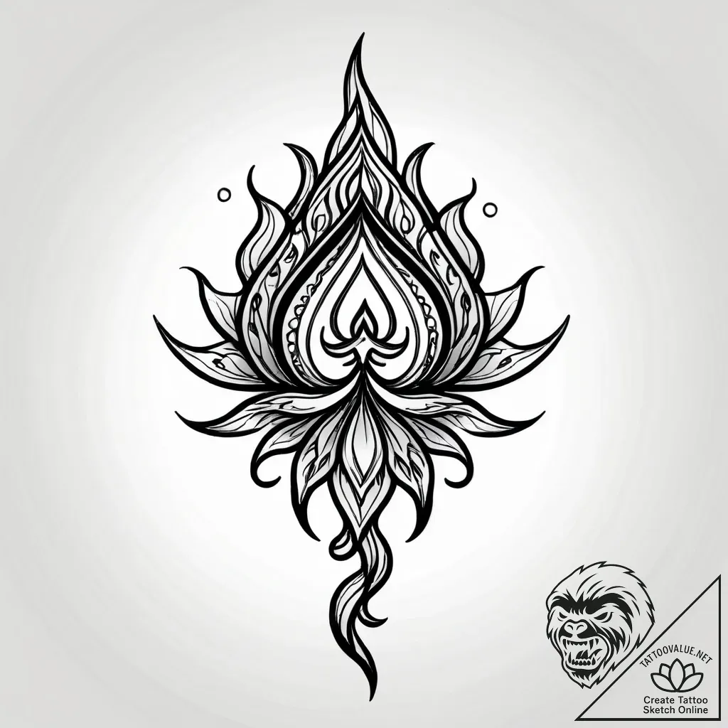 This tattoo sketch is a mesmerizing dance of spirit and flame, rendered in a striking graphic style with intricate dotwork elements. Its dynamic, abstract form resembles a fiery bloom, with delicate w
