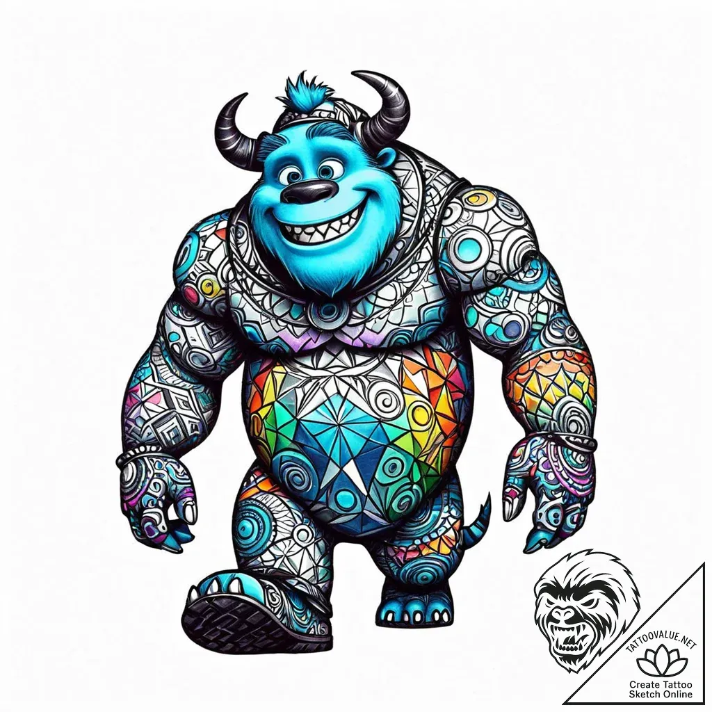 Sulley, a character known for his protective nature and gentle heart beneath a formidable exterior, symbolizes hidden strength and a nurturing spirit. The intricate geometric patterns can represent order, complexity, and the interconnectedness of life, while the vibrant colors express joy, creativity, and a zest for life. This tattoo can signify embracing one's inner power and radiating positivity.