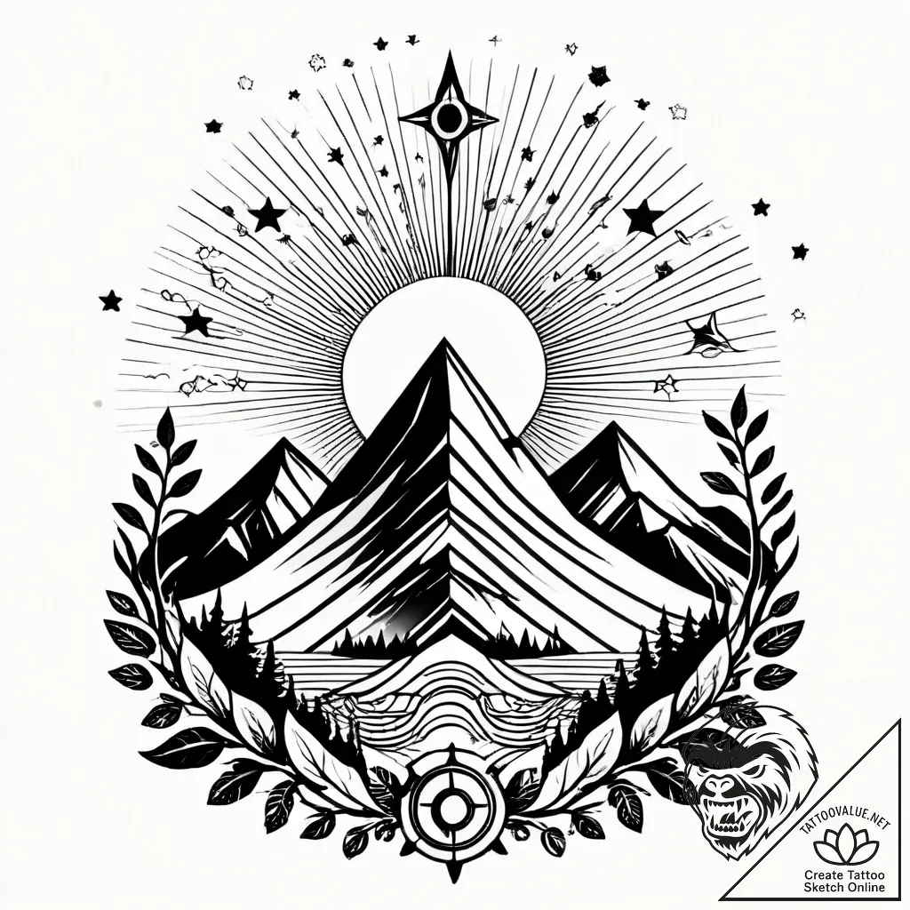 This tattoo is a potent emblem of nature's enduring strength and the perpetual cycle of renewal and rebirth. The rising sun over mountains signifies overcoming challenges and embracing fresh starts, while the surrounding foliage and celestial elements speak to growth, wisdom, and interconnectedness within the universe. It's a declaration of resilience and a celebration of life's powerful, regenerative forces.