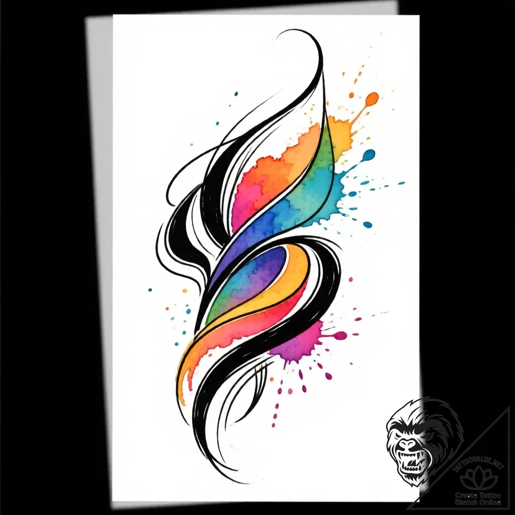 This design is a symphony of movement, where black linework dances with ethereal watercolor splashes, evoking the spirit of a vibrant, untamed force. The delicate, single-needle style creates an impression of spontaneous artistry, like a captured moment of pure creative energy bursting forth.