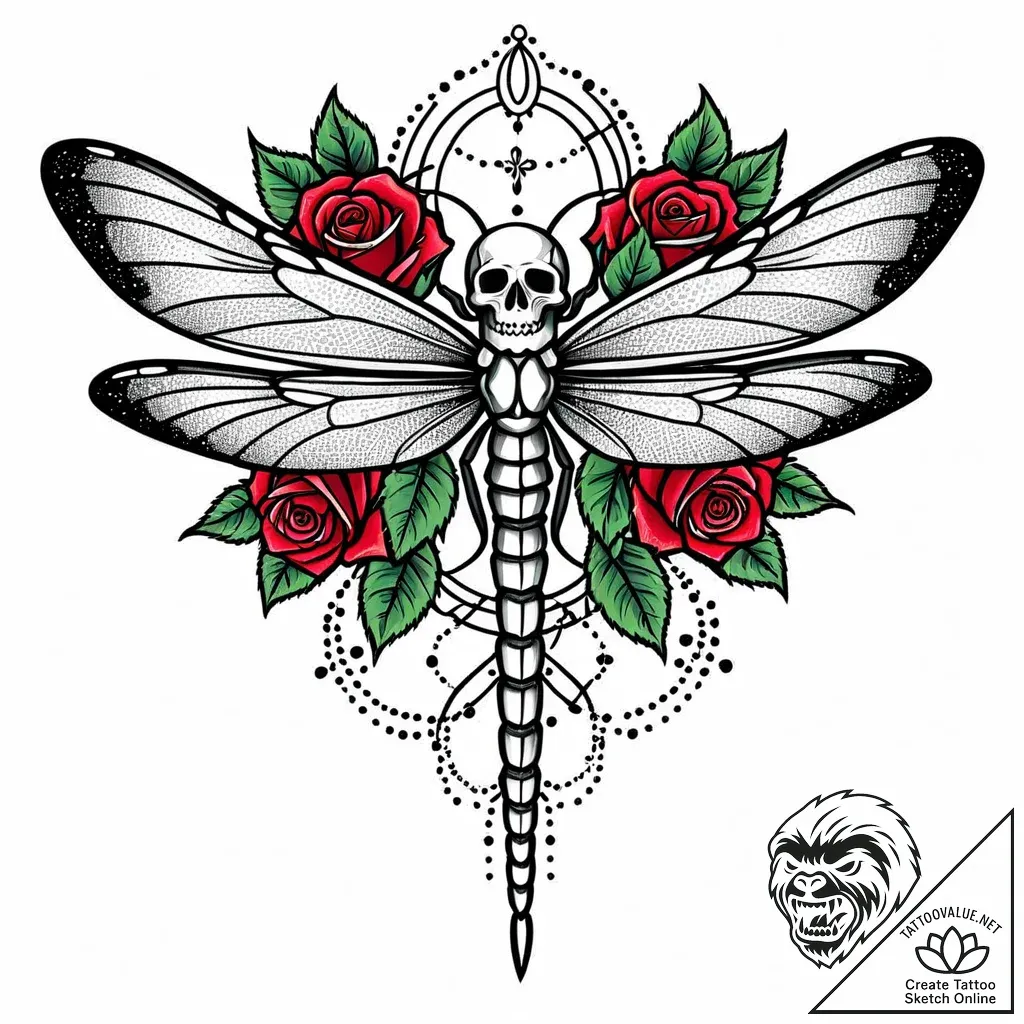 This striking design merges the ethereal grace of a dragonfly with the stark symbolism of a skull, creating a powerful memento mori. Rendered in a fine-line black and grey style with vibrant rose accents, it embodies a delicate balance between life and mortality, movement and stillness. The intricate wing patterns and ornate linework suggest a piece that is both ephemeral and enduring.