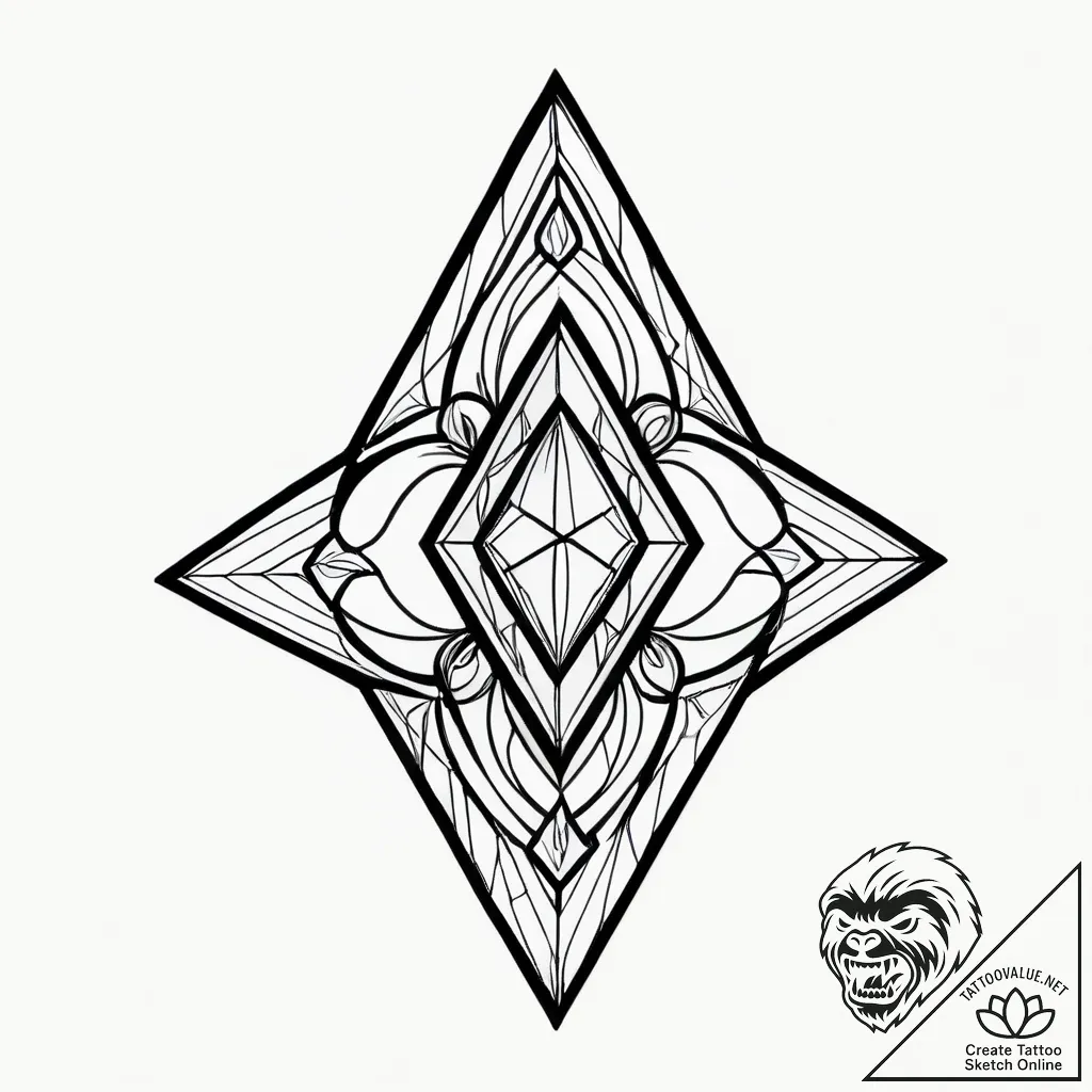 This sketch is a delicate dance of sharp geometric lines and flowing organic curves, forming a diamond that feels both ancient and futuristic. It evokes the essence of a stained-glass window in a hidd