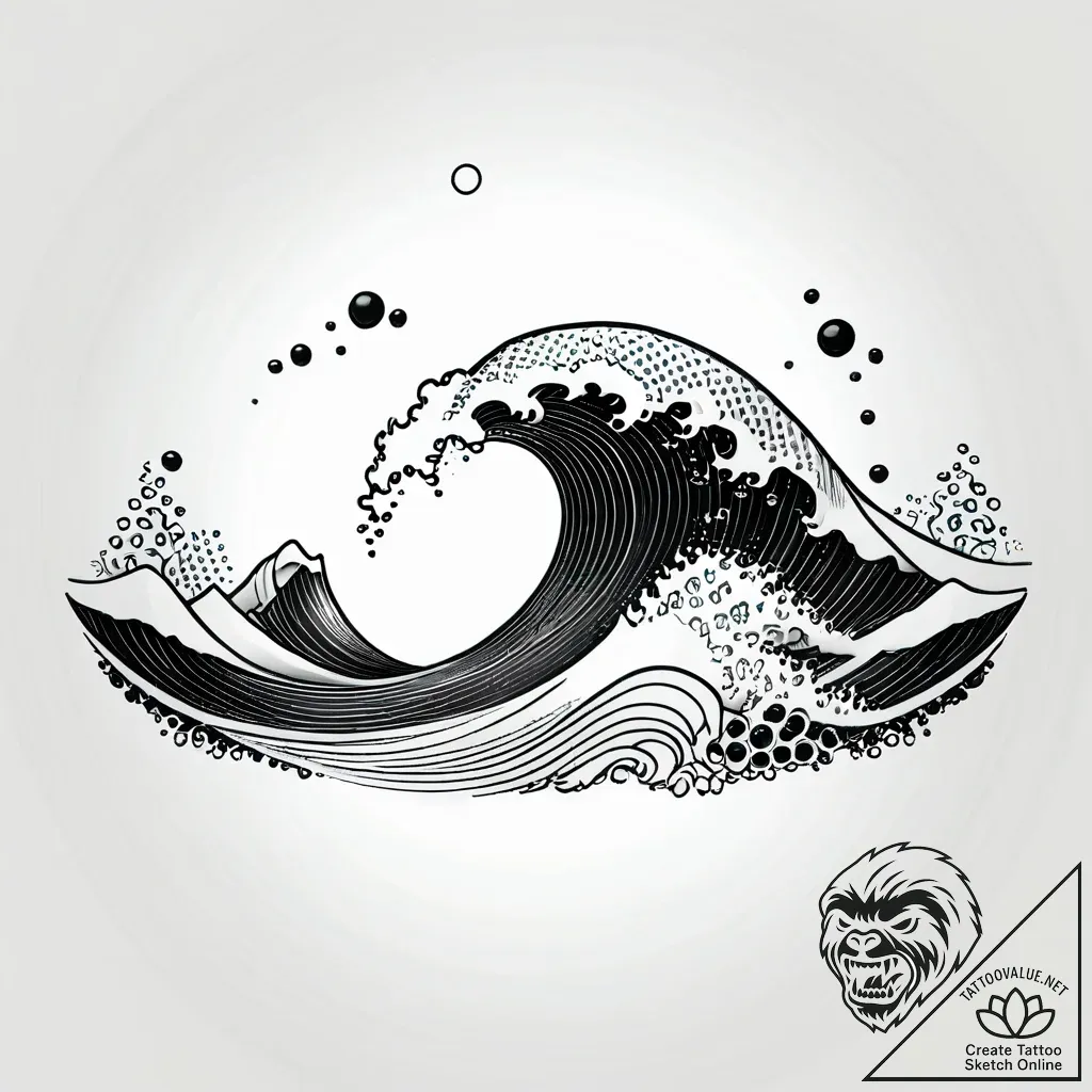 This sketch captures the serene power of the ocean, with a solitary wave cresting in a delicate, almost ephemeral dance. Rendered in a realistic black and grey with soft shading and fine lines, it evokes a vintage tattoo feel, reminiscent of classic ukiyo-e prints, while the subtle dotwork and rising bubbles add a touch of lively detail.