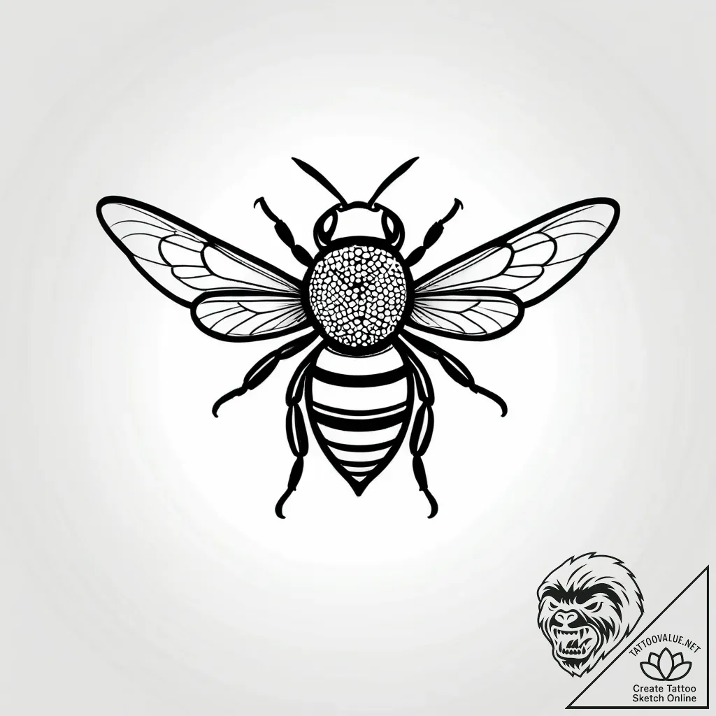 This striking black and white sketch captures a stylized bee, rendered with bold, classic lines reminiscent of old-school American traditional tattoos. The intricate cross-hatching on its abdomen and