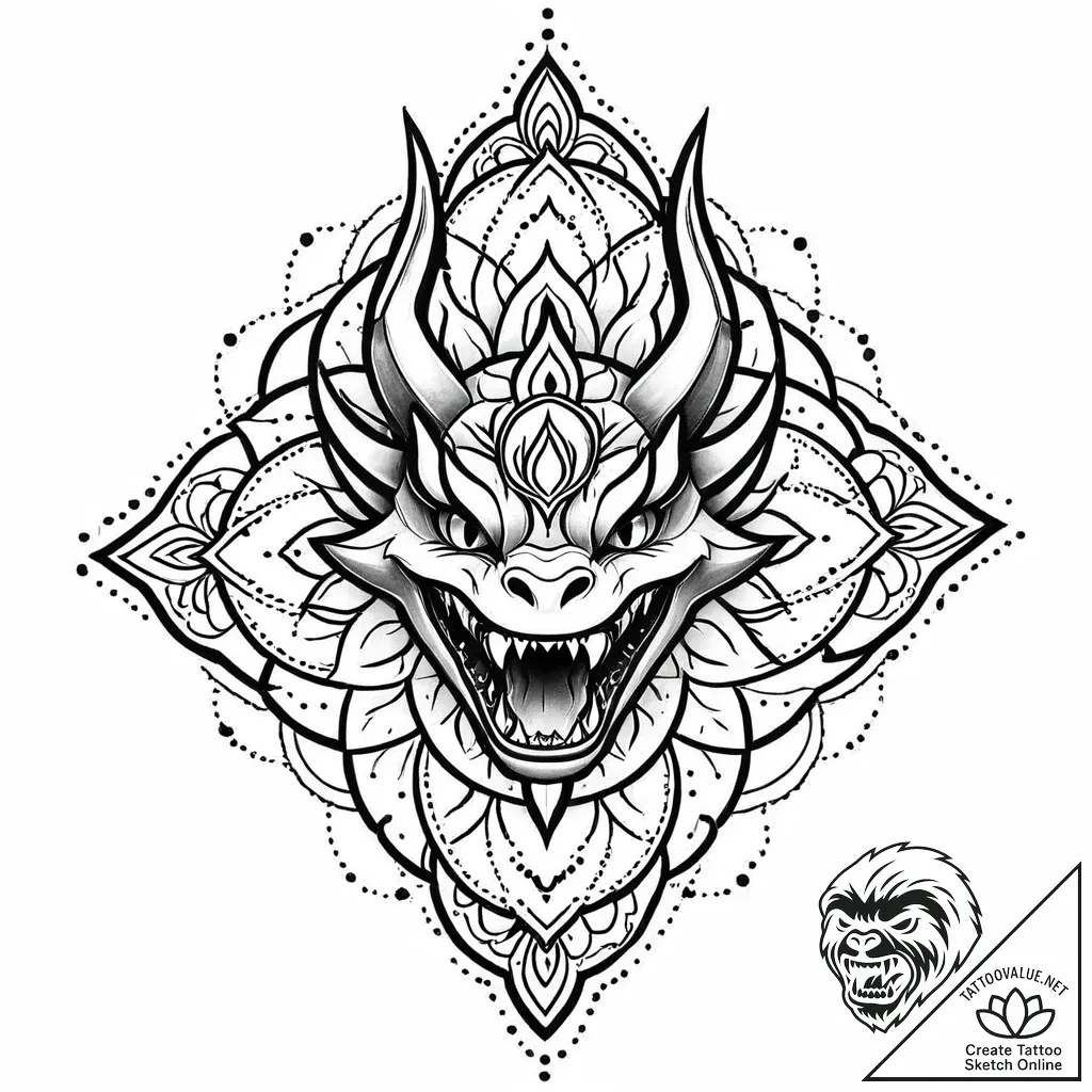 This striking sketch captures the raw power of a dragon's roar, rendered with bold, heavy linework and a touch of sacred geometry. The dragon's fierce gaze, framed by intricate, mandala-like patterns, embodies a primal energy that pulses through the composition, creating a powerful, dynamic, and visually arresting piece.