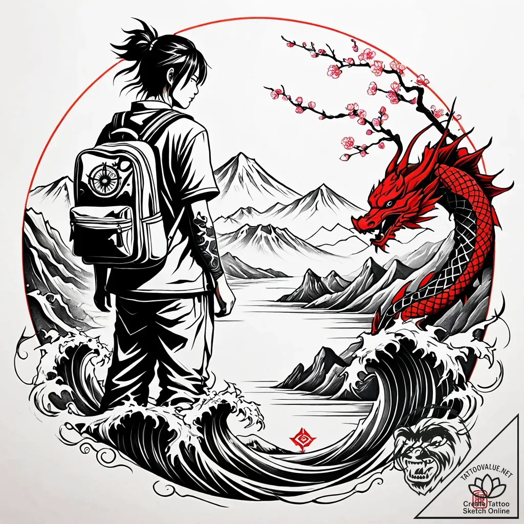 - Original User Request (RU): tattoo sketch, traveler with backpack standing on cliff overlooking vast landscape, compass and map tattoo symbols, concept art for tattoo, black and red ink, red accent, dramatic two-tone, on a clean white paper, isolated, fine lines, delicate linework, single needle style, irezumi japanese tattoo style, traditional japanese motifs (dragon, koi, Hannya, sakura, waves)