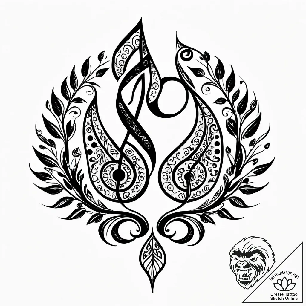 This sketch is a delicate dance between organic forms and sharp graphic lines, reminiscent of an ancient tapestry woven with musical notes. The central composition, a symmetrical embrace of swirling patterns and delicate leaves, evokes a sense of harmony and intricate beauty. The dotwork shading adds a tactile, almost whispered texture, giving the design a vintage soul and a contemporary edge.