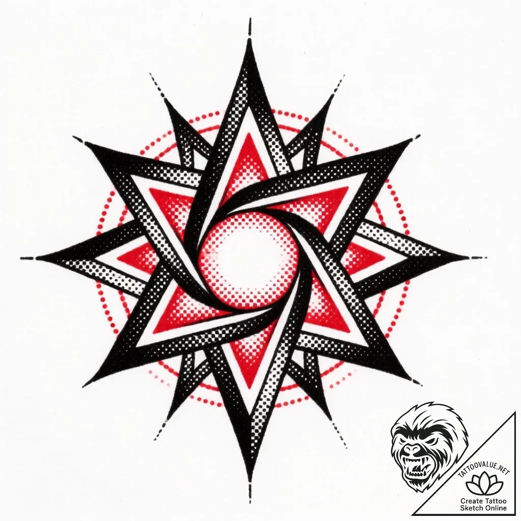 This striking design, rendered in a precise dotwork style, evokes a mystical vortex of energy, like a celestial bloom unfolding. The interplay of sharp black linework, vibrant red accents, and delicate stippling creates a dynamic and visually captivating mandala, suggesting a protective force emanating from its core.